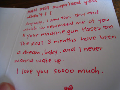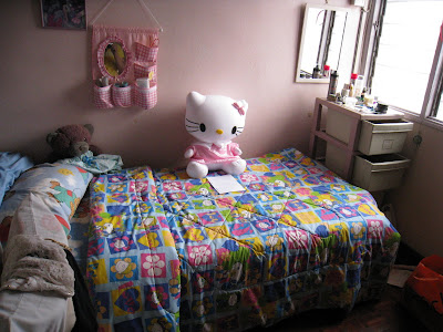 Then I cleared her bed of the 100 other stuffed toys there (especially the ones from her previous ex-bf *grumbles*) except for her favourite childhood one and I left the Hello Kitty right in the middle with a note from me.