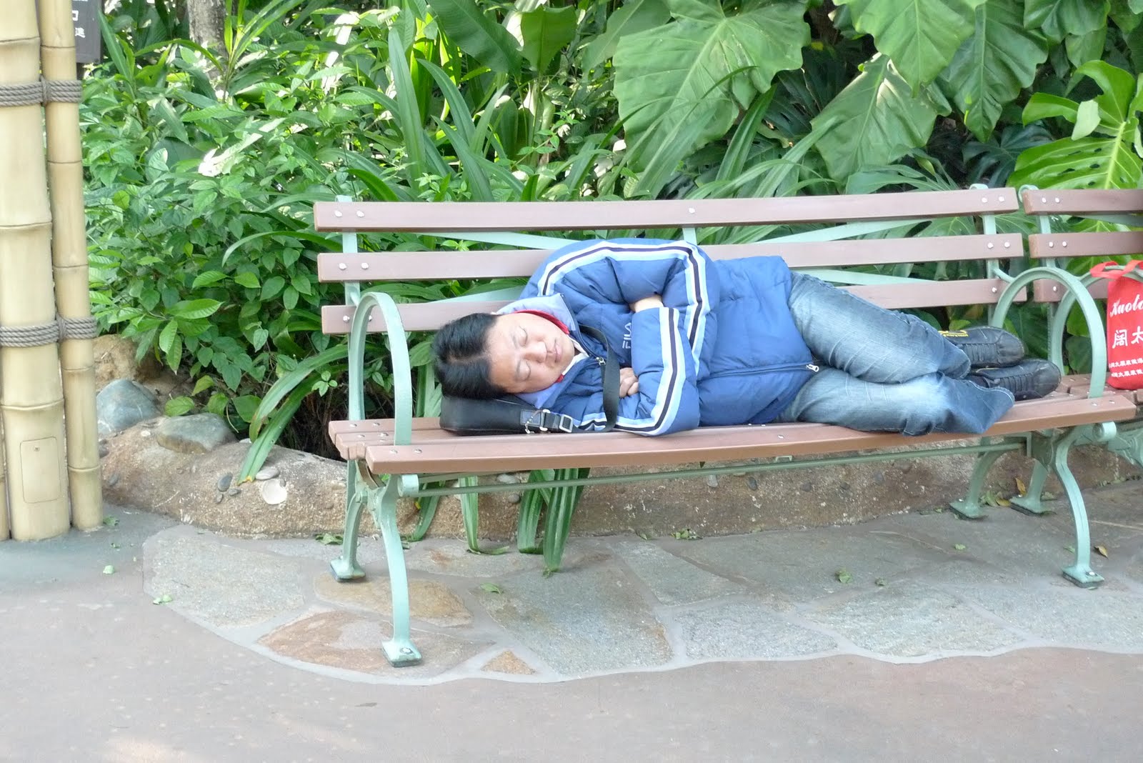 HAHA nono he’s not homeless. There are no homeless people in Disneyland. He’s just a guy taking a nap.