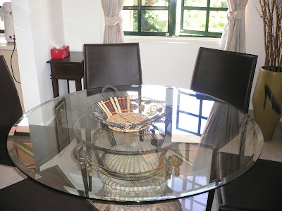 and a small dining table at another corner.