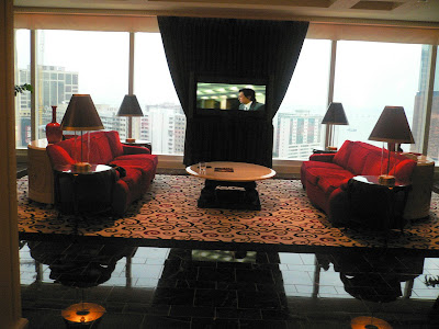 When you walk into the suite, this is exactly how it looks like.There’s a living room with a plasma screen TV by the windows.